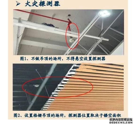 8、常见问题 不做吊顶的场所火灾探测器悬空设置,未安装到顶板上;格栅通透率较低的场所,火灾探测器不得安装在格栅吊顶上方。