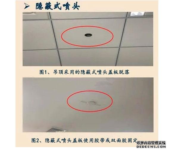 12、常见问题 吊顶采用的隐蔽式喷头盖板脱落或是为了防止脱落使用胶带或双面胶固定,影响喷头在火灾时受热感应与脱落进行正常喷水。